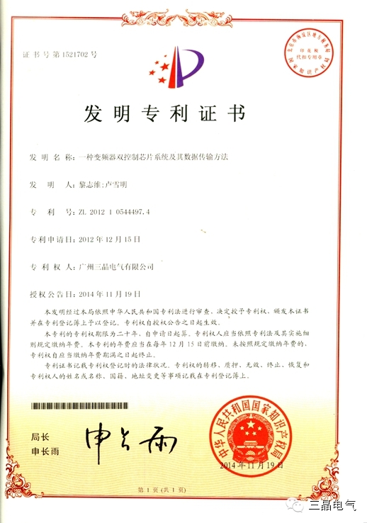 近日,三晶电气变频器喜获中华人民共和国国家知识产权局颁发的两项发明专利,分别为: