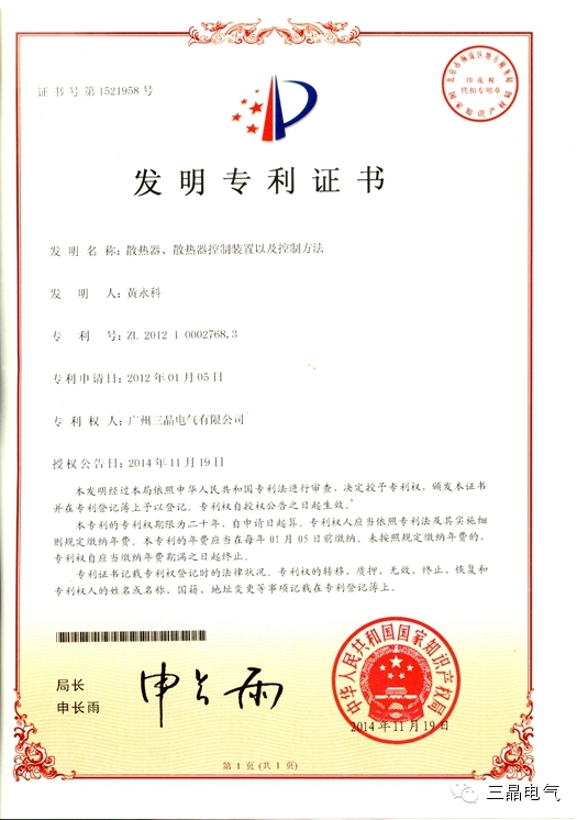 2. 发明专利,专利号:ZL 2012 1 0002768.3,专利名称:散热器、散热器控制装置以及控制方法。变频器核心元件模块具有高频、高压、高速和IC高度密集化等特点,这些使得电子元件单位体积内的发热量迅速增加,不仅影响其本身的使用寿命,更有可能导致设备工作不稳定甚至烧毁设备。本项发明专利克服了变频器传统散热技术的缺点和不足,提供了一种散热效果更好、可靠性更高、成本更低的散热控制装置及其控制方法,这意味着三晶电气的变频器可以更多地使用在高温恶劣环境中而不影响使用寿命及性能。
